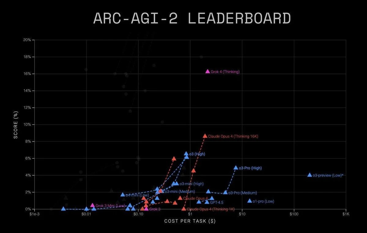 This also explains Grok 4’s efficiency. While Claude Opus 4 (Thinking 16K) achieved strong scores by extending its context and inference chain length, Grok 4 did more with less—leaning on the emergent structure of learned reasoning instead of expensive token-level manipulations.